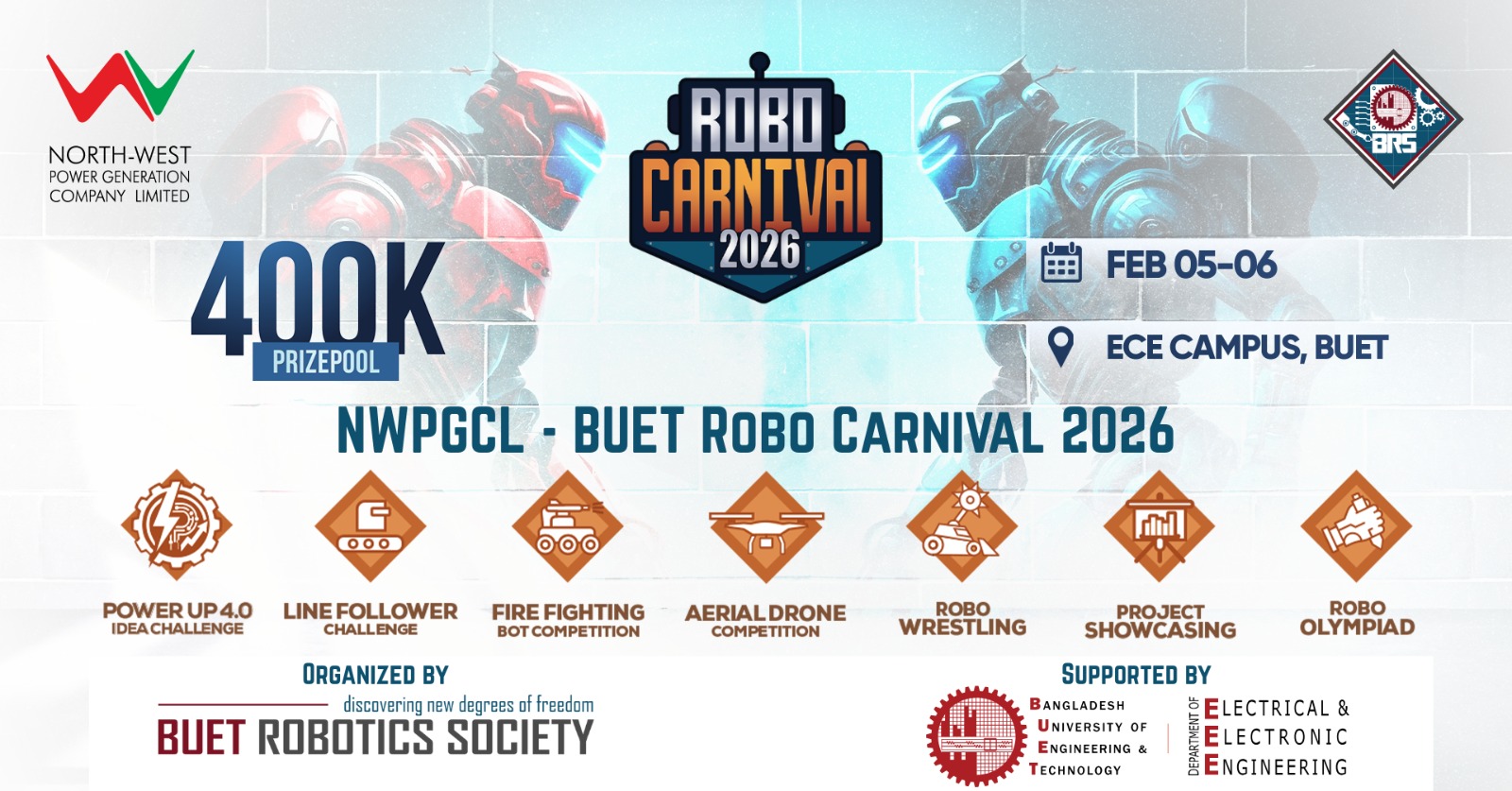 NWPGCL-BUET Robo Carnival 2026, Inspiring Innovation: Robotics and AI for a Sustainable Future to be held on 5th and 6th February, 2026. The event is sponsored by North West Power Generation Company Ltd., organized by BUET Robotic Society and supported by the Dept. of EEE. Program Schedule: